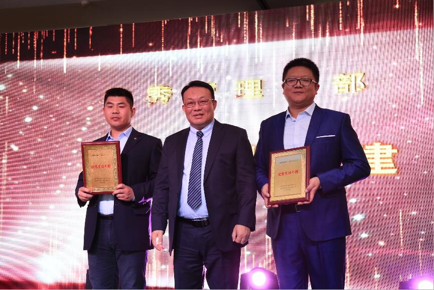 公司董事长顾东先生与总经理陈露女士分别为评选为2017年度优秀管理干部、优秀员工和明日之星的员工颁发奖牌并合影留念。